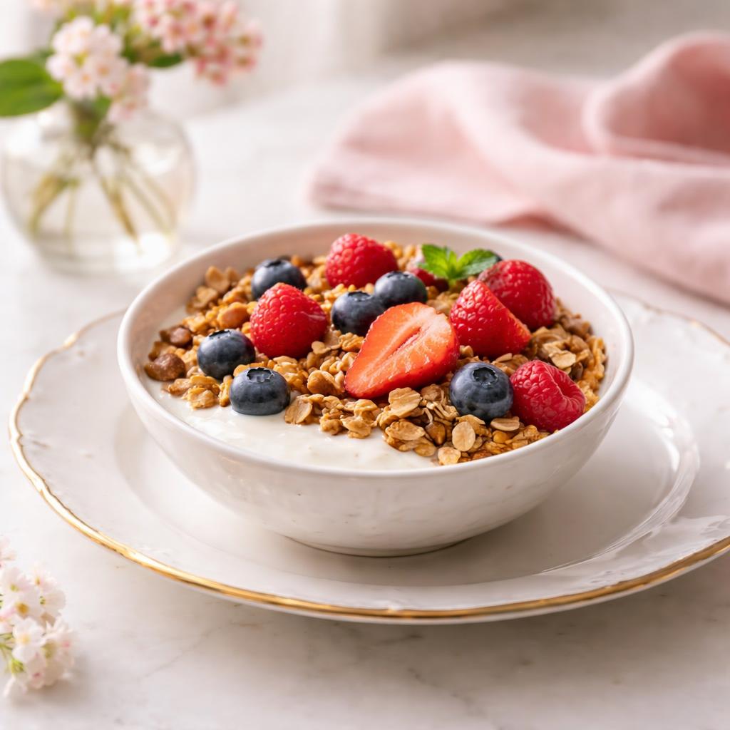 House-made granola with Greek yogurt, seasonal berries, and wildflower honey