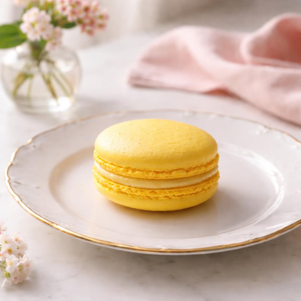 Bright lemon macaron with zesty citrus curd filling in sunshine yellow shells