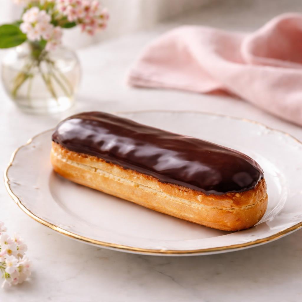 Delicate choux pastry filled with chocolate pastry cream and glazed with glossy dark chocolate