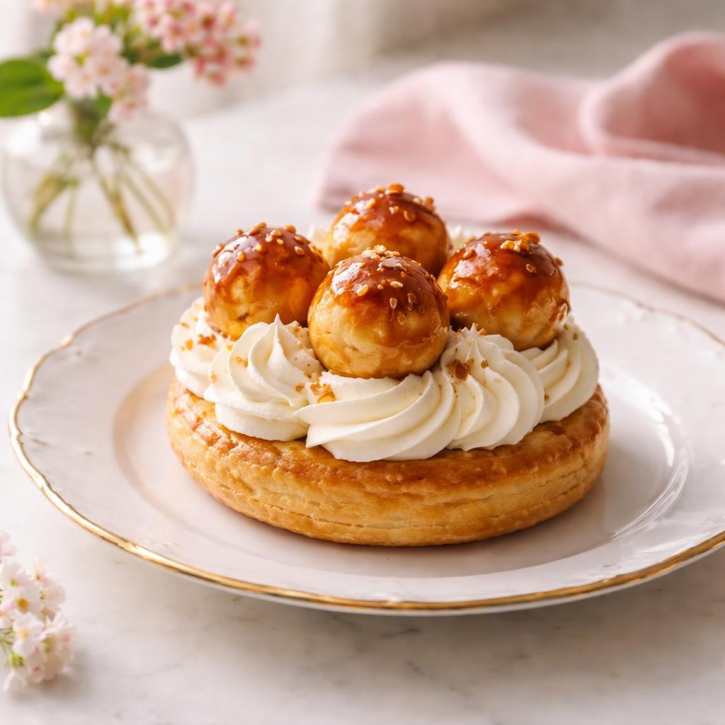 Puff pastry base topped with caramelized cream puffs and vanilla Chiboust cream