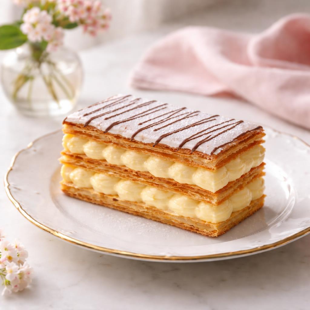 Napoleon of crisp puff pastry layers with vanilla crème pâtissière and fondant glaze