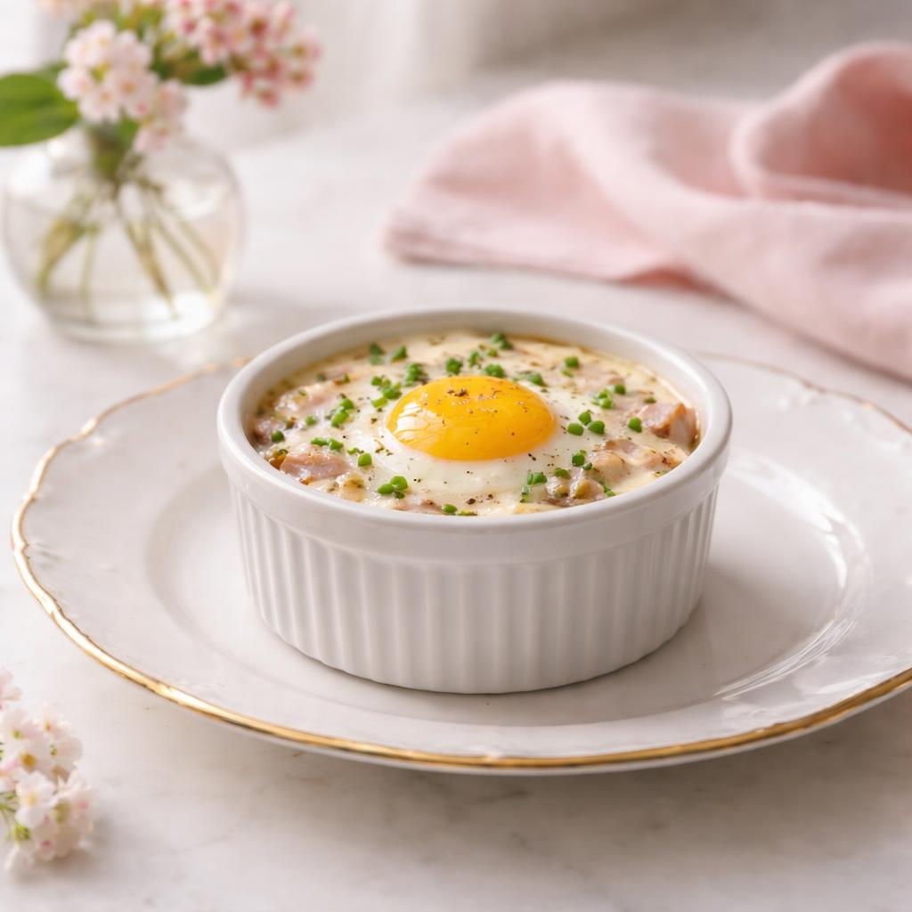 Farm-fresh egg baked in a ramekin with crème fraîche and fresh herbs