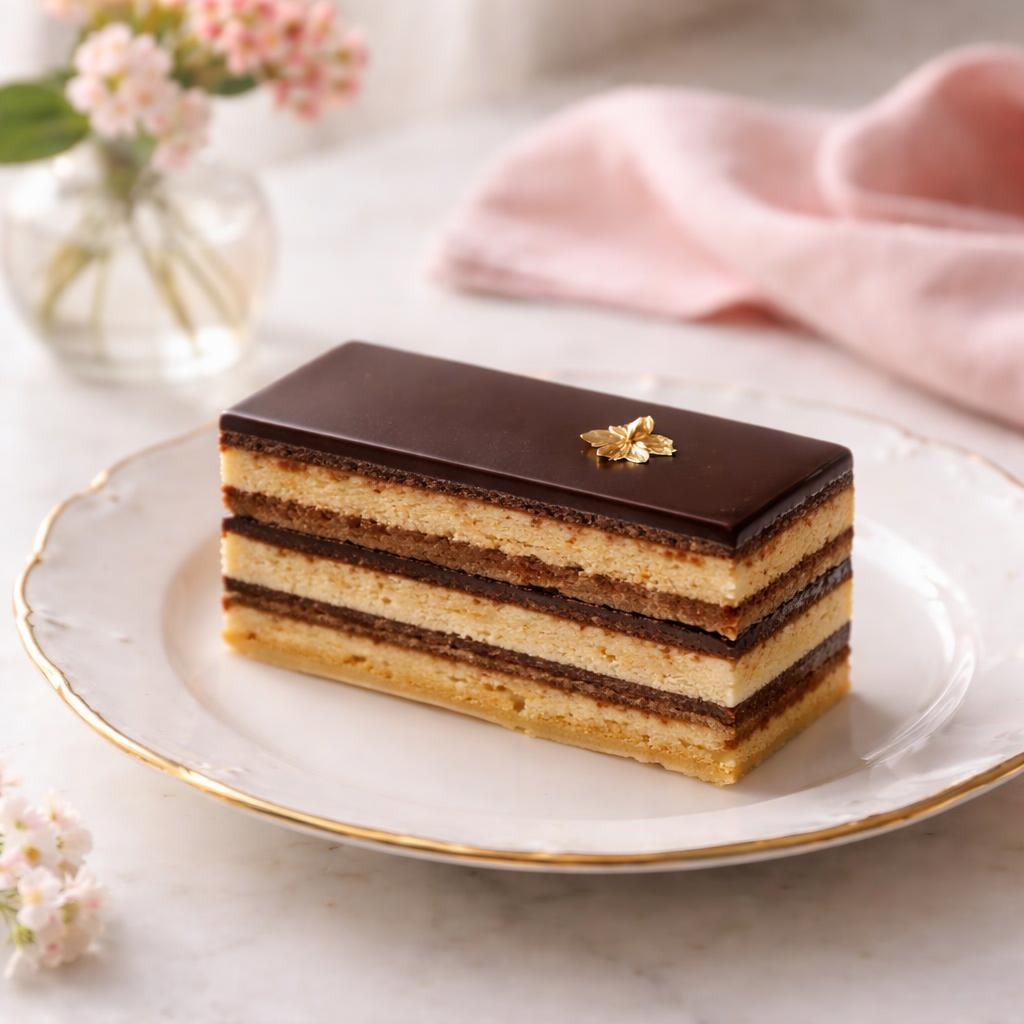 Almond sponge soaked in coffee syrup, layered with coffee buttercream and dark chocolate ganache