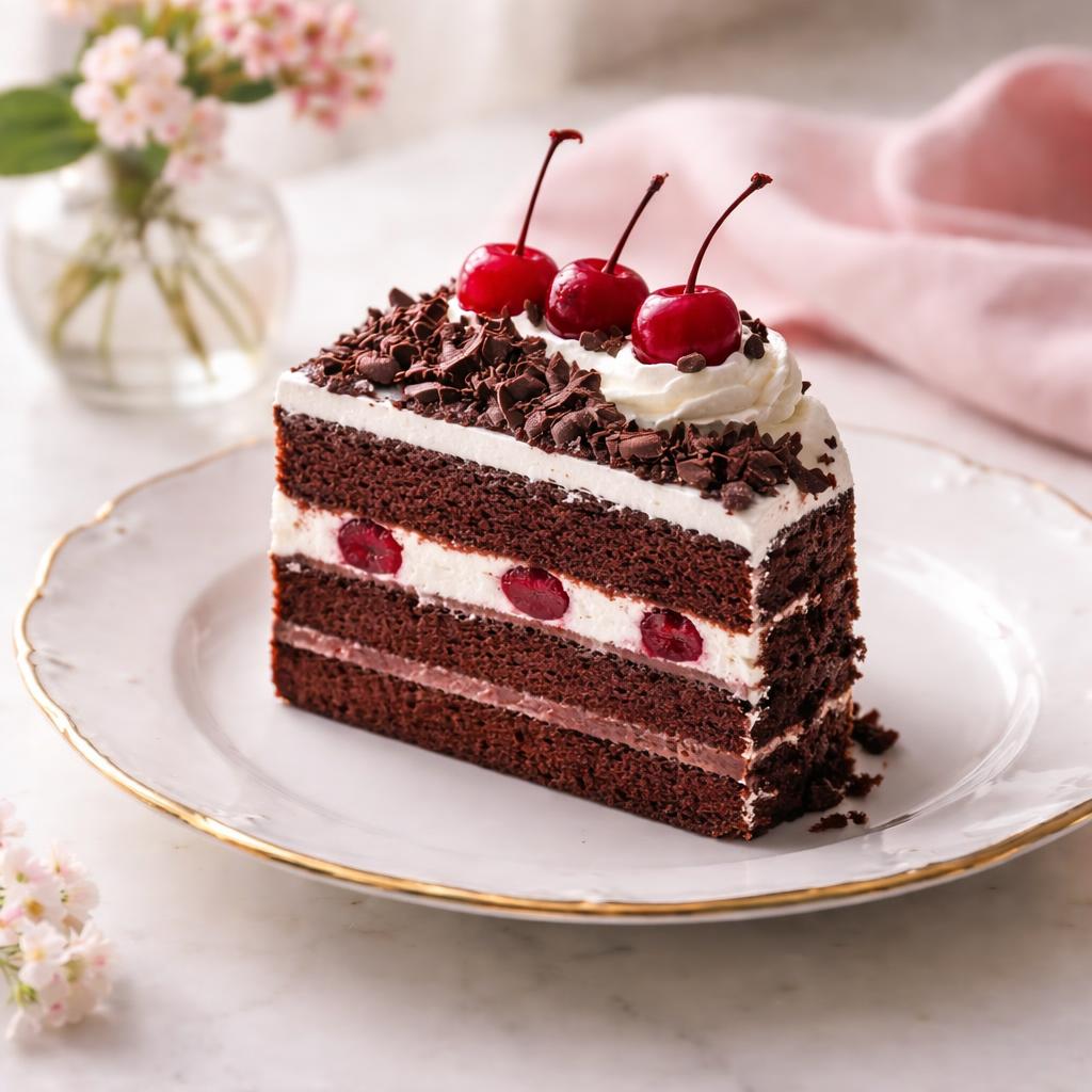 Black Forest gâteau with chocolate génoise, Kirsch-soaked cherries, and dark chocolate shavings