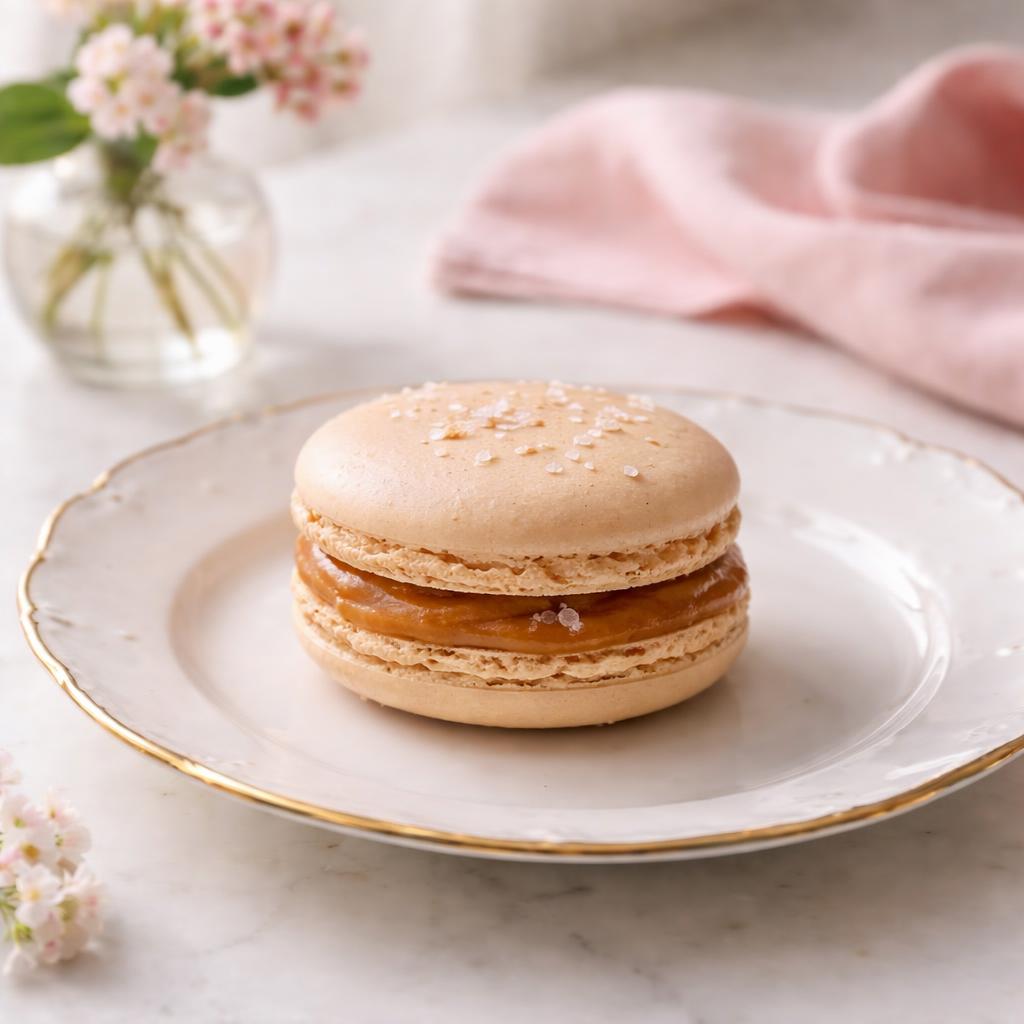 Salted butter caramel macaron with smooth caramel filling and a hint of fleur de sel