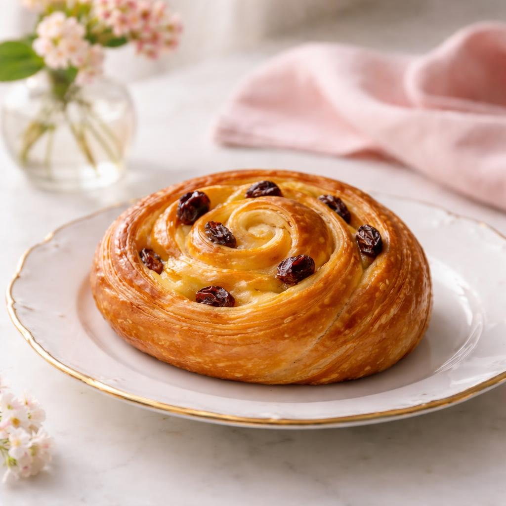 Spiral-shaped pastry with plump raisins and delicate vanilla-scented crème pâtissière