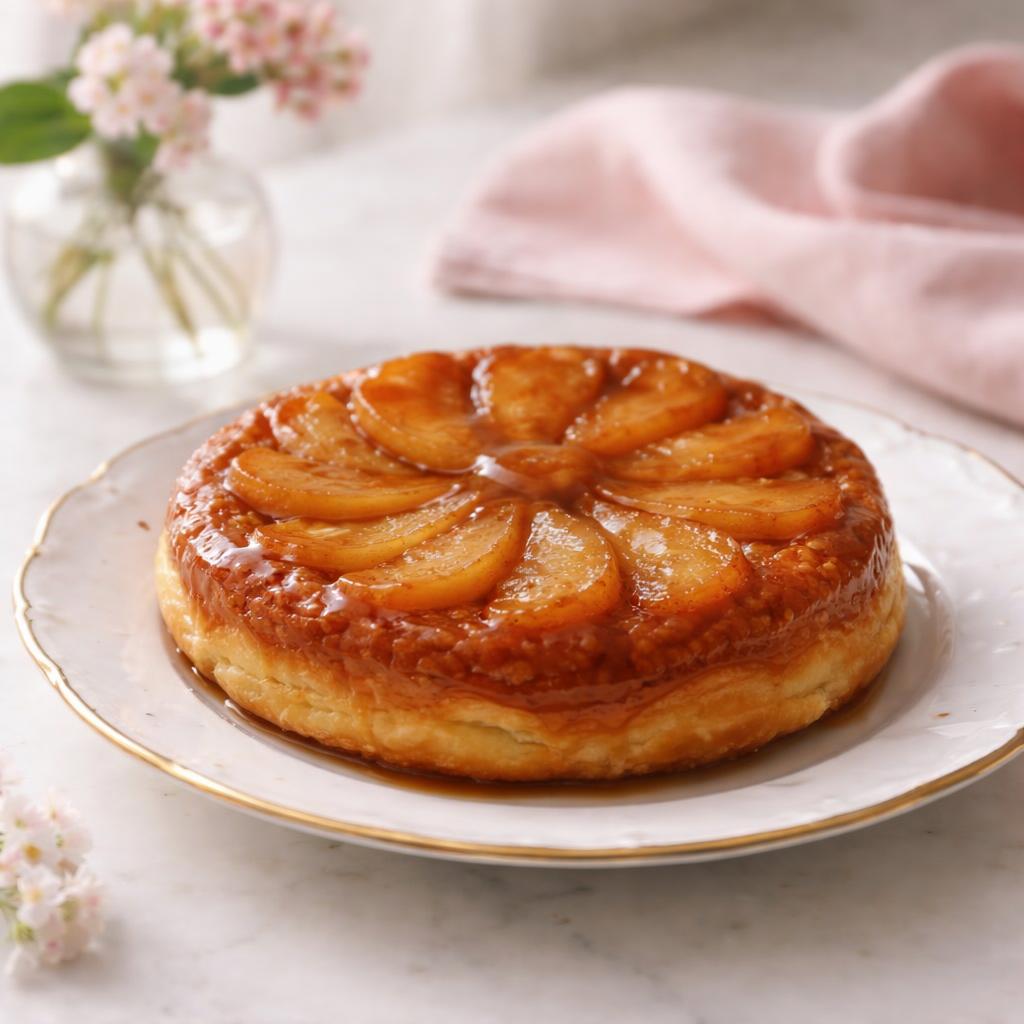 Upside-down caramelized apple tart with buttery puff pastry, served warm with crème fraîche