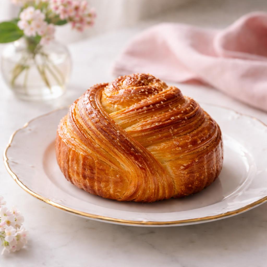 A luxurious marriage of tender brioche dough and laminated puff pastry, brushed with pearl sugar