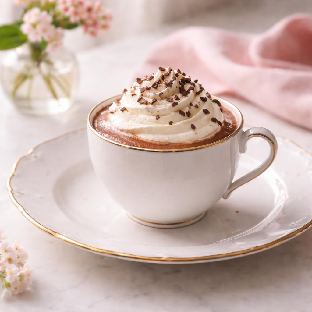 Rich hot chocolate made with Valrhona chocolate and topped with Chantilly cream